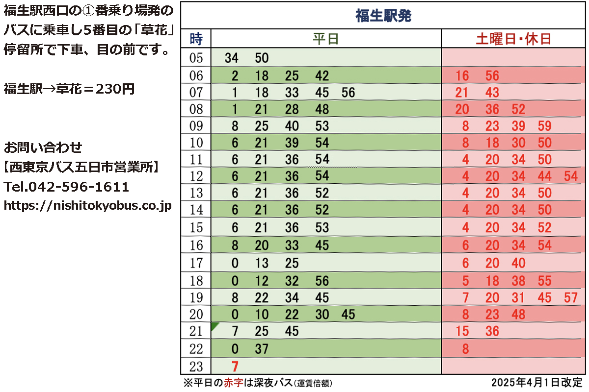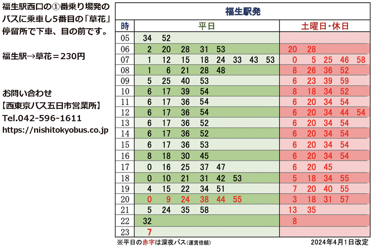 福生発 西東京バス平井経由五日市行きまたは、日の出折返場行き「草花」下車、バス停前(所要時間約10分)