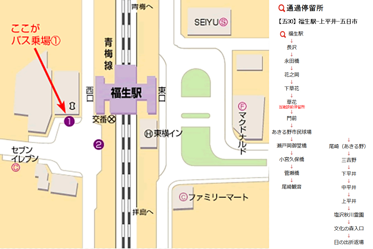 バス便は、福生駅からの乗車にて5つ目のバス停下車、目の前が当施設です。